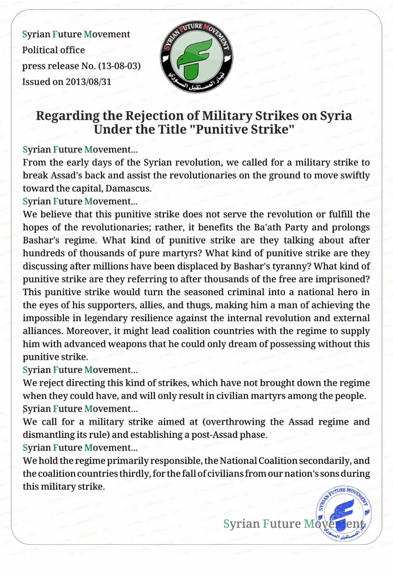 An analysis of the Syrian Future Movement's position on the punitive strike and its impact on the Syrian revolution and