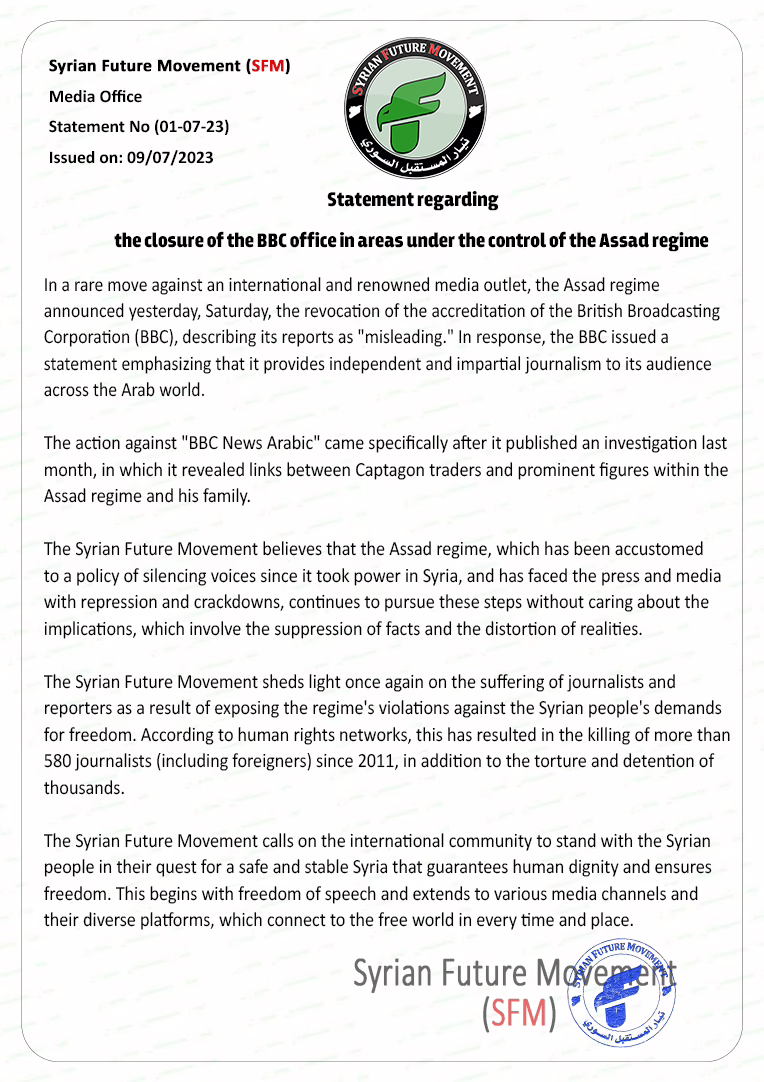 The Syrian Future Movement believes that the Assad regime, which has been accustomed to a policy of silencing voices since it took power in Syria, and has faced the press and media with repression and crackdowns, continues to pursue these steps without caring about the implications, which involve the suppression of facts and the distortion of realities.