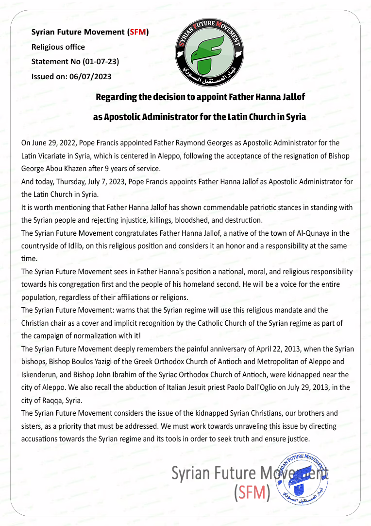 The Syrian Future Movement congratulates Father Hanna Jallof, a native of the town of Al-Qunaya in the countryside of Idlib, on this religious position and considers it an honor and a responsibility at the same time.