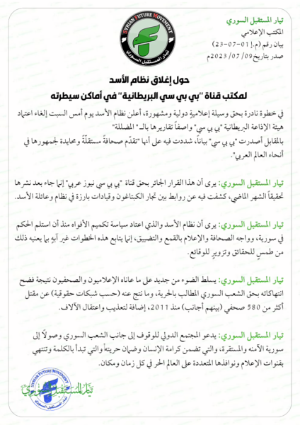 The Syrian Future Movement believes that this unjust decision against BBC News Arabic came after it published an investigation last month revealing links between Captagon dealers and prominent leaders in the Assad regime and family.