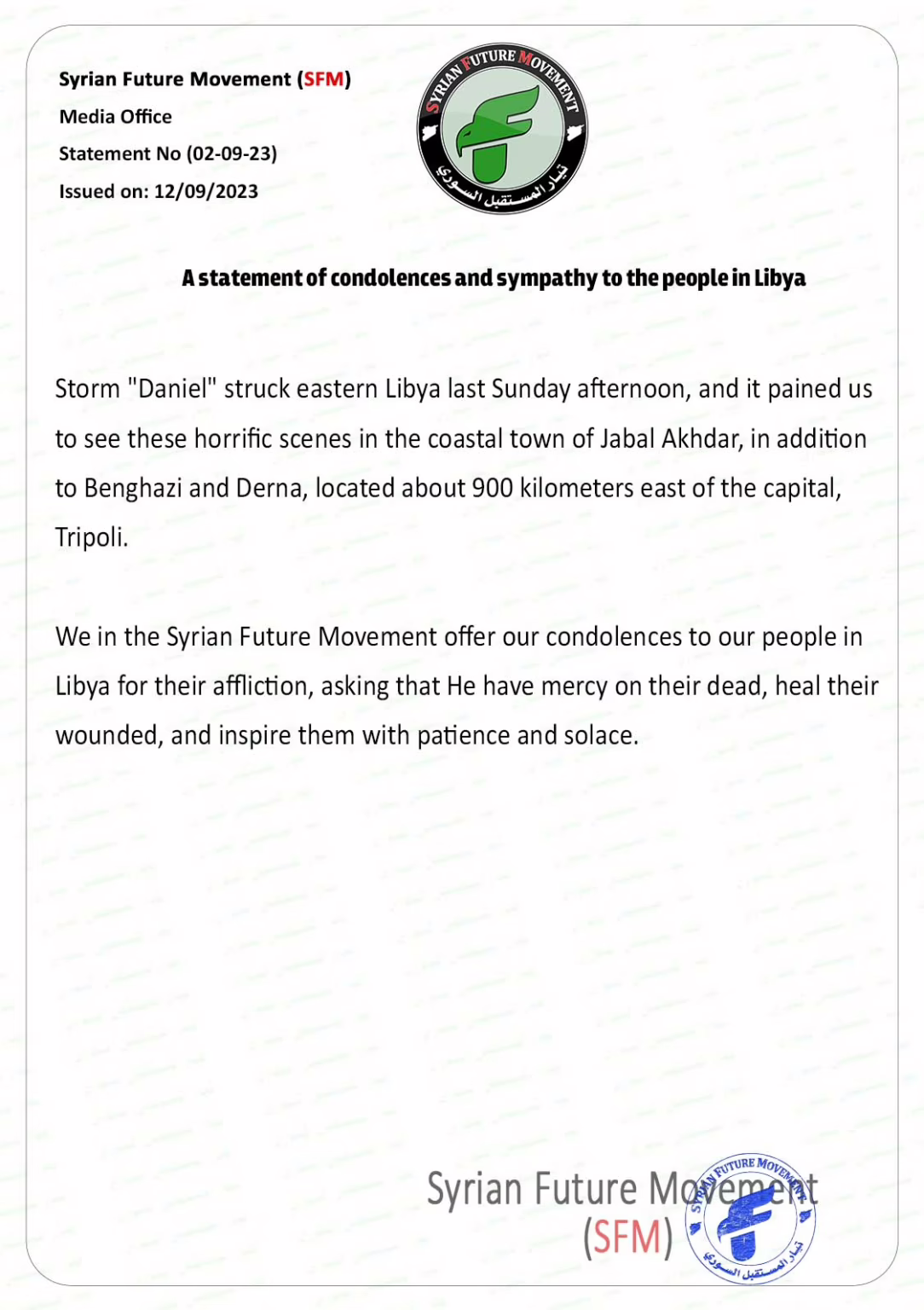 We in the Syrian Future Movement offer our condolences to our people in Libya for their affliction, asking that He have mercy on their dead, heal their wounded, and inspire them with patience and solace.