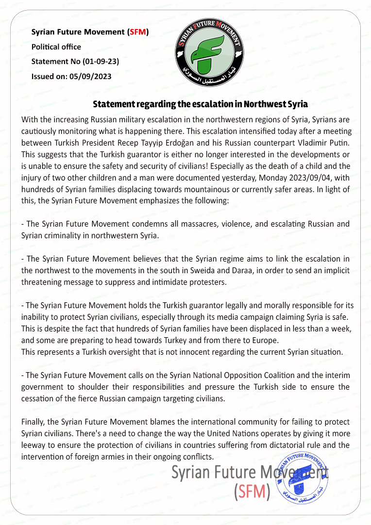 With the increasing Russian military escalation in the northwestern regions of Syria, Syrians are cautiously monitoring what is happening there. This escalation intensified today after a meeting between Turkish President Recep Tayyip Erdoğan and his Russian counterpart Vladimir Putin. This suggests that the Turkish guarantor is either no longer interested in the developments or is unable to ensure the safety and security of civilians! Especially as the death of a child and the injury of two other children and a man were documented yesterday, Monday 2023/09/04, with hundreds of Syrian families displacing towards mountainous or currently safer areas. In light of this, the Syrian Future Movement emphasizes the following: