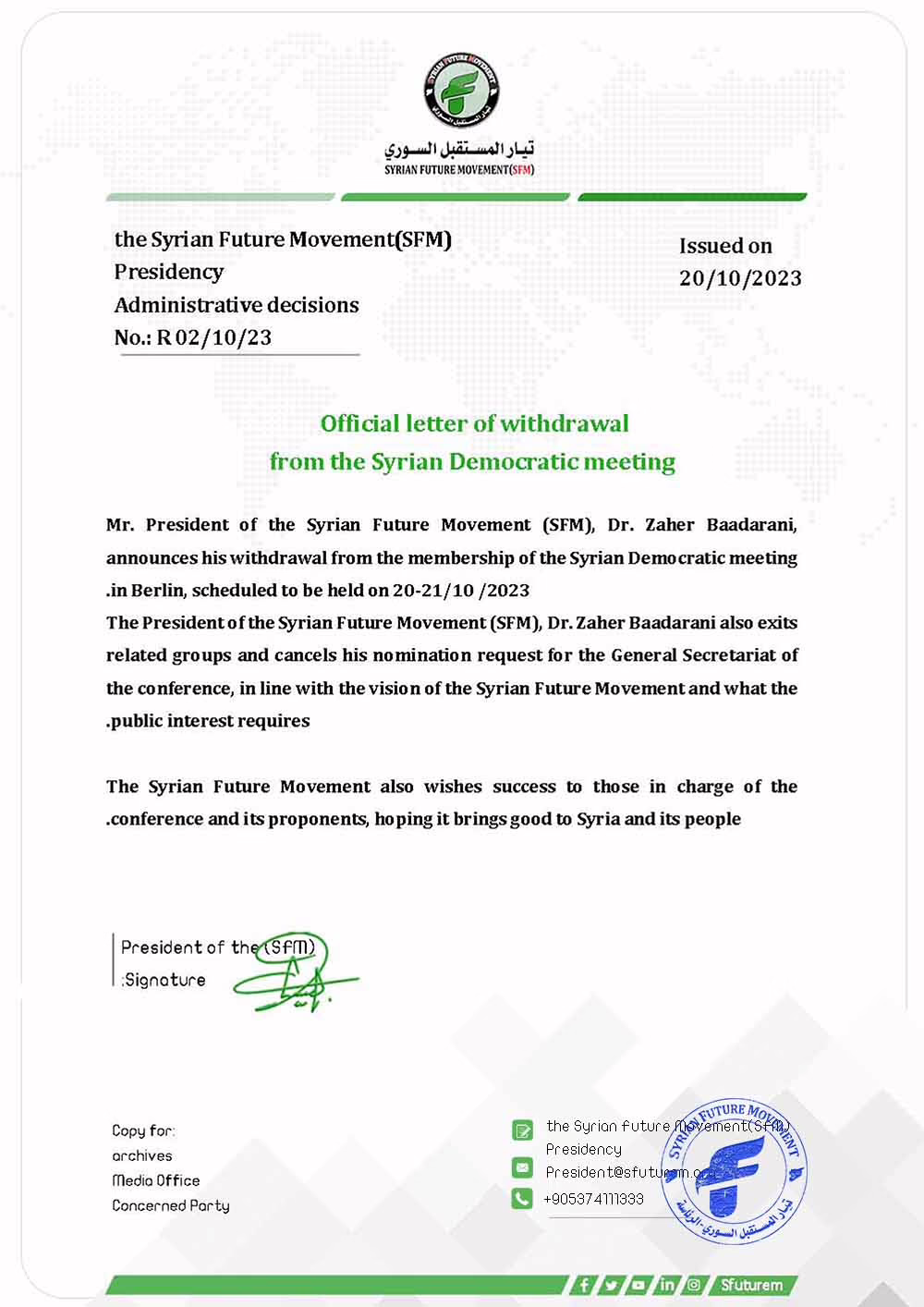 The President of the Syrian Future Movement (SFM), Dr. Zaher Baadarani also exits related groups and cancels his nomination request for the General Secretariat of the conference, in line with the vision of the Syrian Future Movement and what the public interest requires