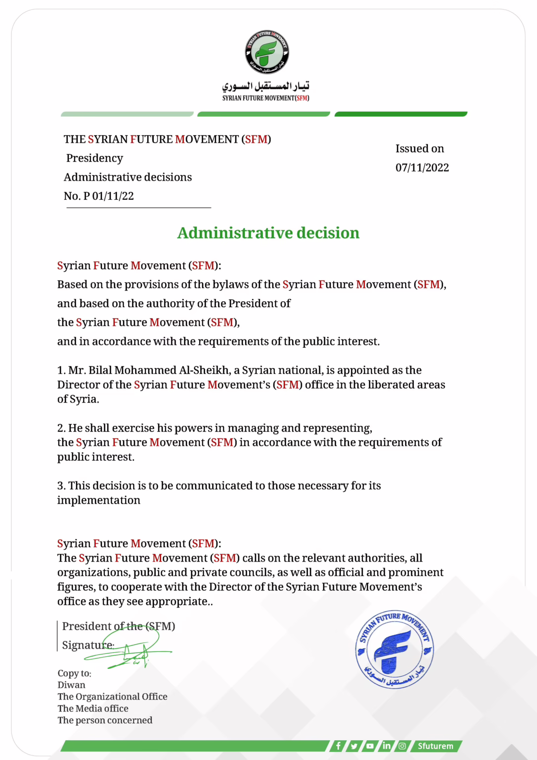 - Mr. Bilal Mohammed Al-Sheikh, a Syrian national, is appointed as the Director of the Syrian Future Movement’s (SFM) office in the liberated areas of Syria.