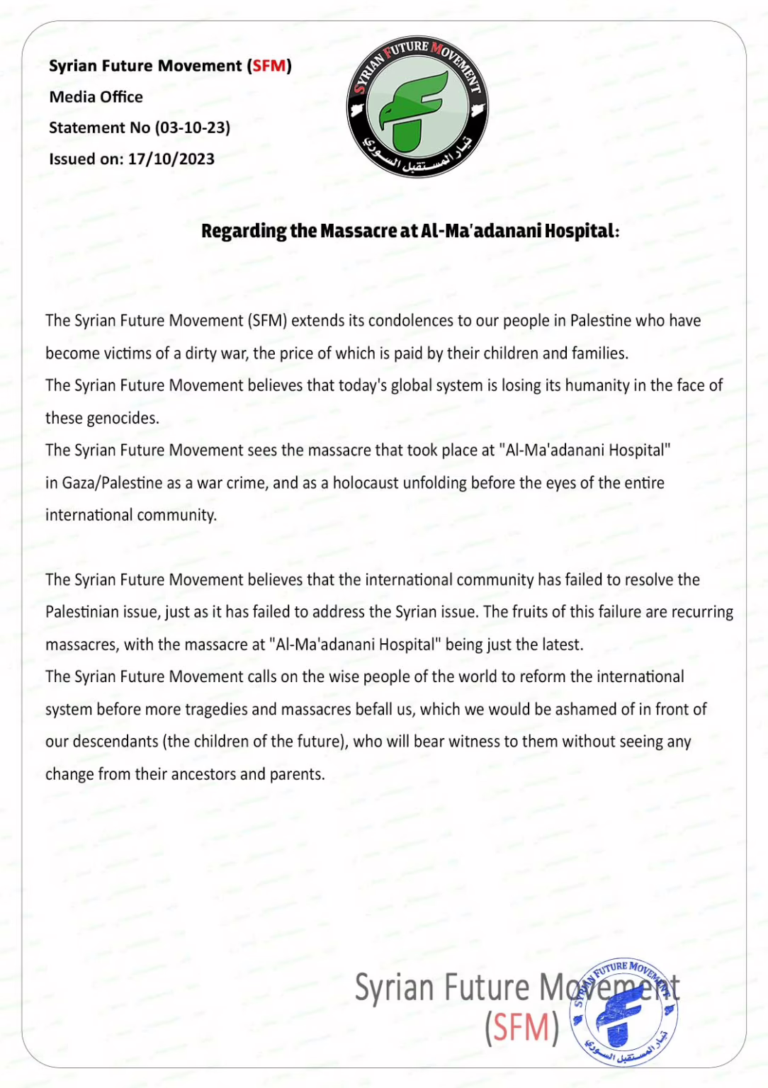 The Syrian Future Movement sees the massacre that took place at “Al-Ma’adanani Hospital” in Gaza/Palestine as a war crime, and as a holocaust unfolding before the eyes of the entire international community.
