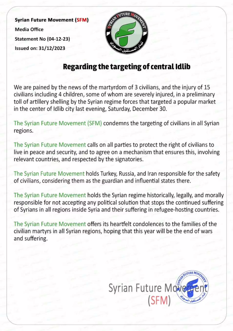 Following the targeting of central Idlib, the Syrian Future Movement condemns the attacks on civilians and calls for their protection.
