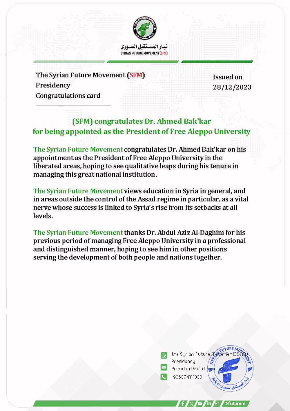 The Syrian Future Movement congratulates Dr. Ahmed Bak’kar on his appointment as the President of Free Aleppo University in the liberated areas, hoping to see qualitative leaps during his tenure in managing this great national institution.
