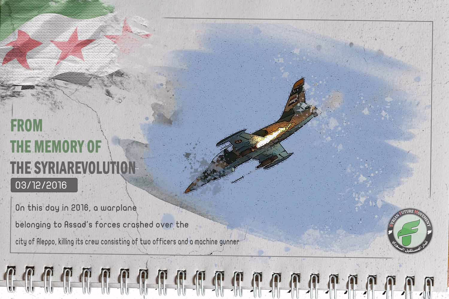 On this day in 2016, a warplane belonging to Assad’s forces crashed over the city of Aleppo, killing its crew consisting of two officers and a machine gunner.