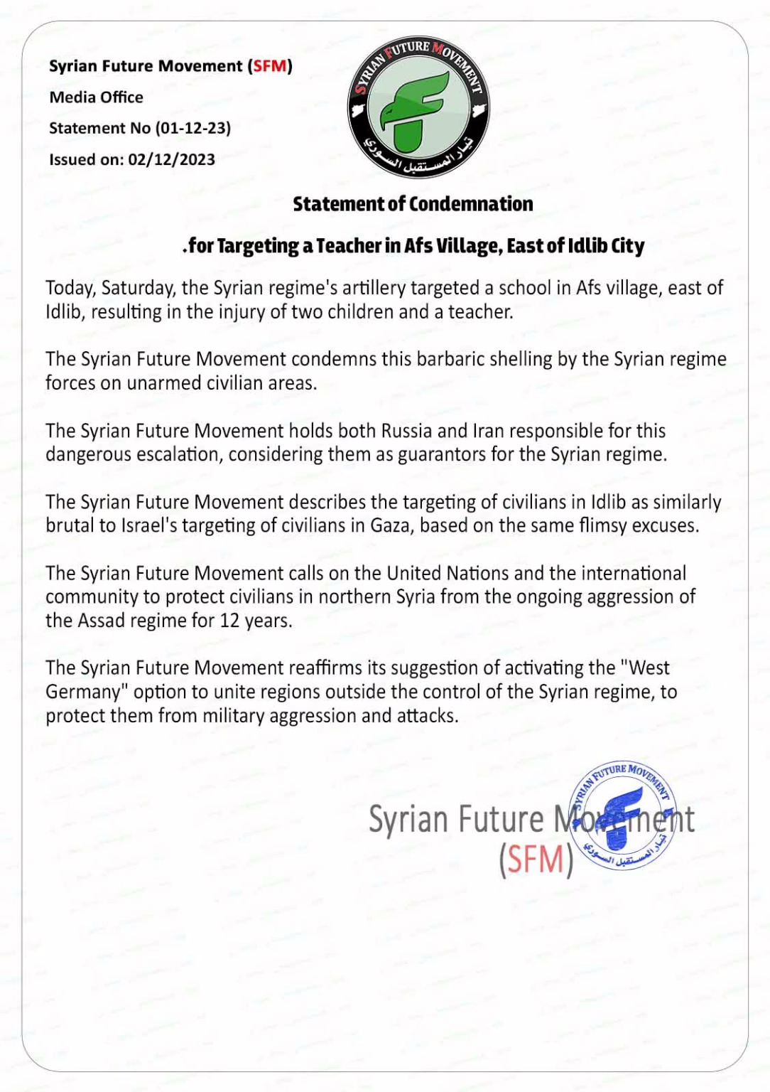 The Syrian Future Movement holds both Russia and Iran responsible for this dangerous escalation, considering them as guarantors for the Syrian regime.