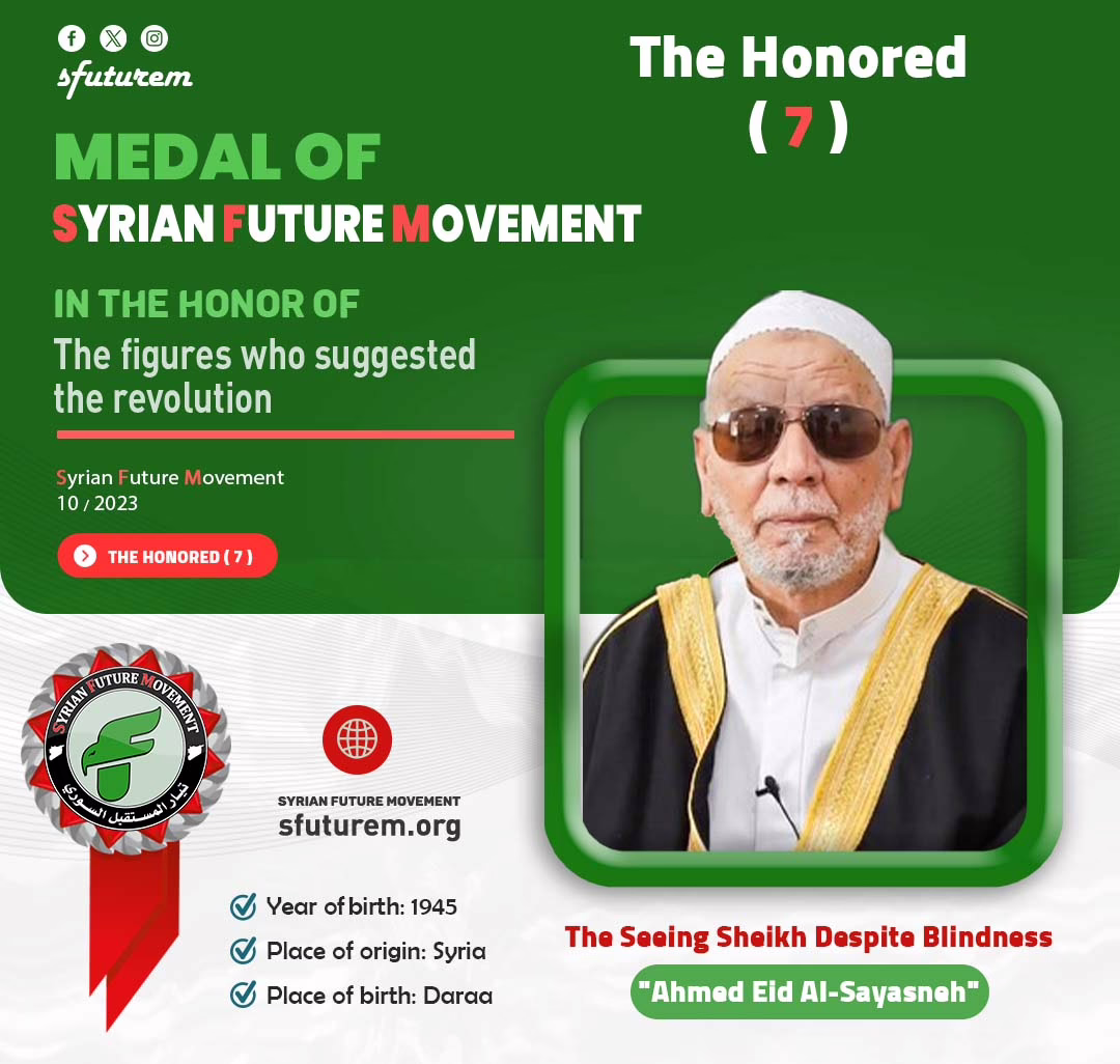 We, in the Syrian Future Movement, salute the loyal national religious figures who do not sell their religion and always stand for the truth, untouched by any political bazaar. We also salute Sheikh Al-Sayasneh, one of the prominent symbols of the Syrian revolution. His national stances serve as a model for our vision in the Syrian Future Movement. In recognition, we bestow upon him the Medal of the Syrian Future Movement as a symbol of national excellence.