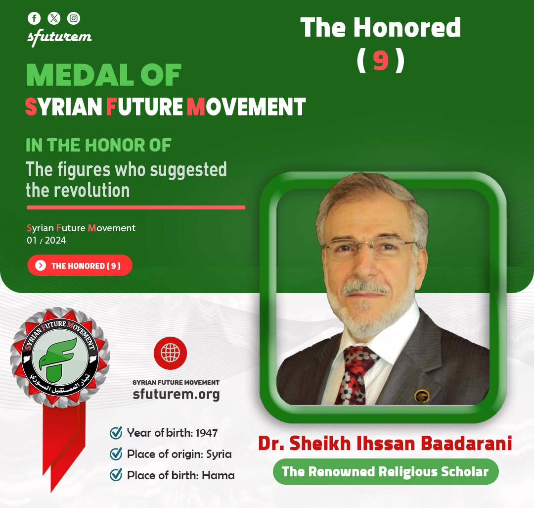 For the reasons mentioned, and in recognition of his merits, we present the Syrian Future Movement Medal this week to Sheikh Ihssan Baadarani, a symbolic Syrian medal that carries our vision and our comprehensive national approach.