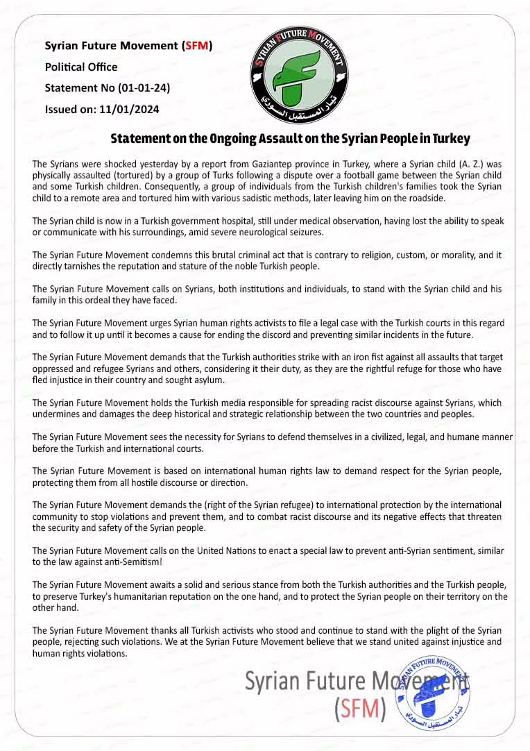The Syrian Future Movement demands that the Turkish authorities strike with an iron fist against all assaults that target oppressed and refugee Syrians and others, considering it their duty, as they are the rightful refuge for those who have fled injustice in their country and sought asylum.