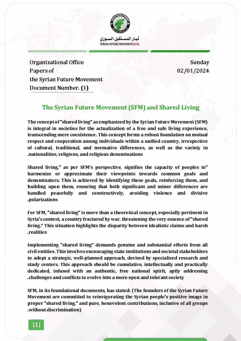The concept of “shared living” as emphasized by the Syrian Future Movement (SFM) is integral in societies for the actualization of a free and safe living experience, transcending mere coexistence. This concept forms a robust foundation on mutual respect and cooperation among individuals within a unified country, irrespective of cultural, traditional, and normative differences, as well as the variety in nationalities, religions, and religious denominations.