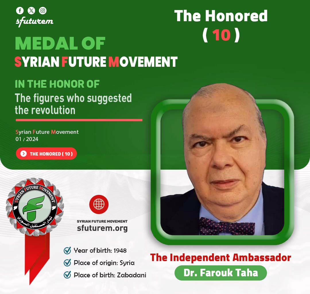 In recognition of his rich and extensive academic, political, and diplomatic history, and for standing with his people in their revolution against injustice and tyranny, we at the Syrian Future Movement present the Syrian Future Movement (SFM) Shield this week to His Excellency Ambassador Dr. “Farouk Taha,” a symbolic Syrian shield embodying our vision and inclusive national approach.