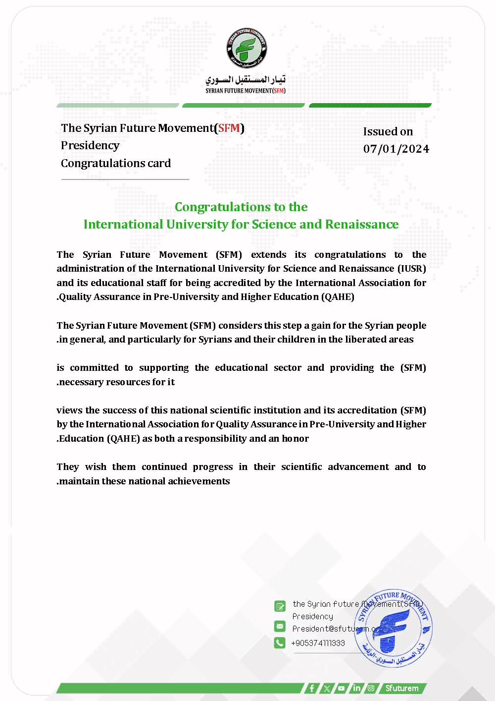 The Syrian Future Movement (SFM) extends its congratulations to the administration of the International University for Science and Renaissance (IUSR) and its educational staff for being accredited by the International Association for Quality Assurance in Pre-University and Higher Education (QAHE).