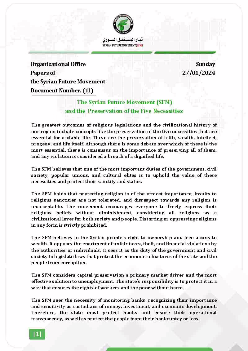 The SFM supports all efforts that elevate the intellect and rejects stagnation and blind imitation without rational evidence. It opposes any tyranny and despotism that belittles the people’s intellect, and rejects any idea that underestimates the Syrian intellect’s ability to govern itself.