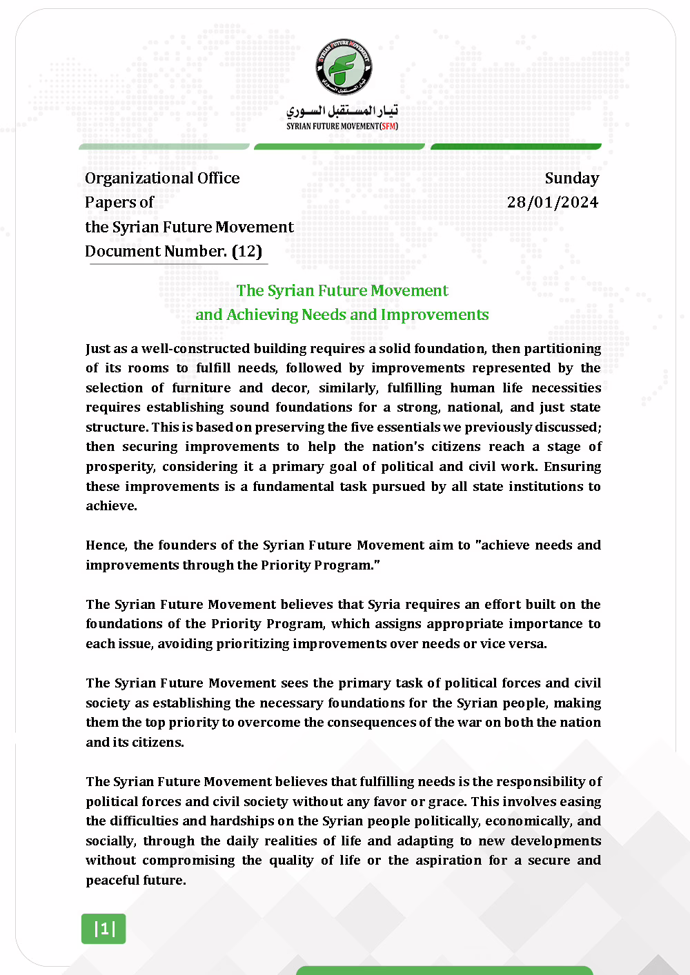 The Syrian Future Movement believes that Syria requires an effort built on the foundations of the Priority Program, which assigns appropriate importance to each issue, avoiding prioritizing improvements over needs or vice versa.