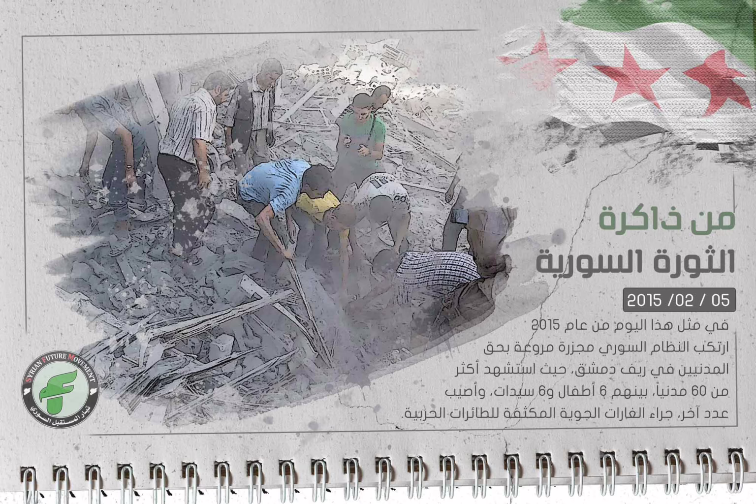 On this day in 2015, the Syrian regime committed a horrific massacre against civilians in the rural Damascus area. More than 60 civilians, including 6 children and 6 women, were killed, and many others were injured, due to intense airstrikes by warplanes.
