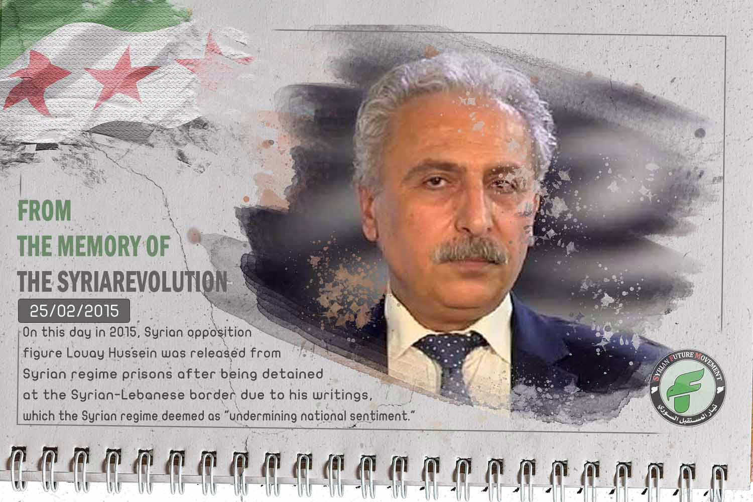 On this day in 2015, Syrian opposition figure Louay Hussein was released from Syrian regime prisons after being detained at the Syrian-Lebanese border due to his writings, which the Syrian regime deemed as “undermining national sentiment.”