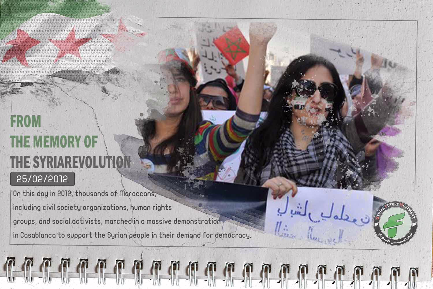 On this day in 2012, thousands of Moroccans, including civil society organizations, human rights groups, and social activists, marched in a massive demonstration in Casablanca to support the Syrian people in their demand for democracy.