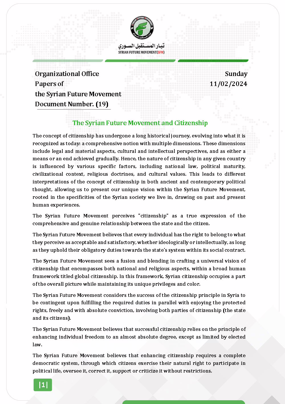 The Syrian Future Movement perceives “citizenship” as a true expression of the comprehensive and genuine relationship between the state and the citizen.