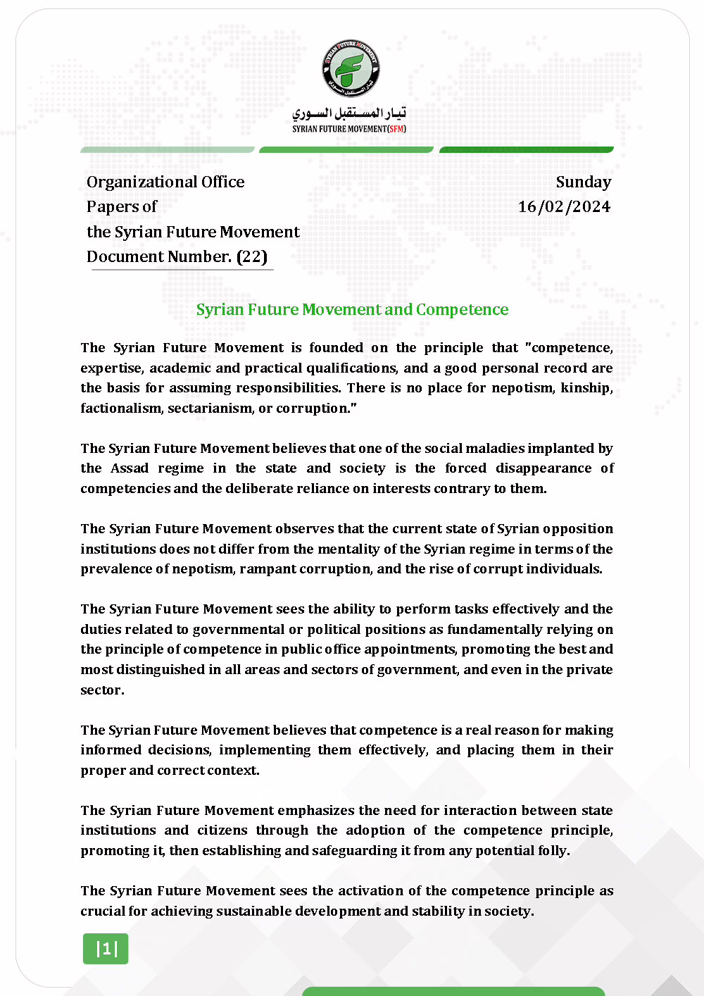 The Syrian Future Movement views competence as being represented by specialized academic ability and cumulative practical experience, rather than personal justice or social background, and the like.
