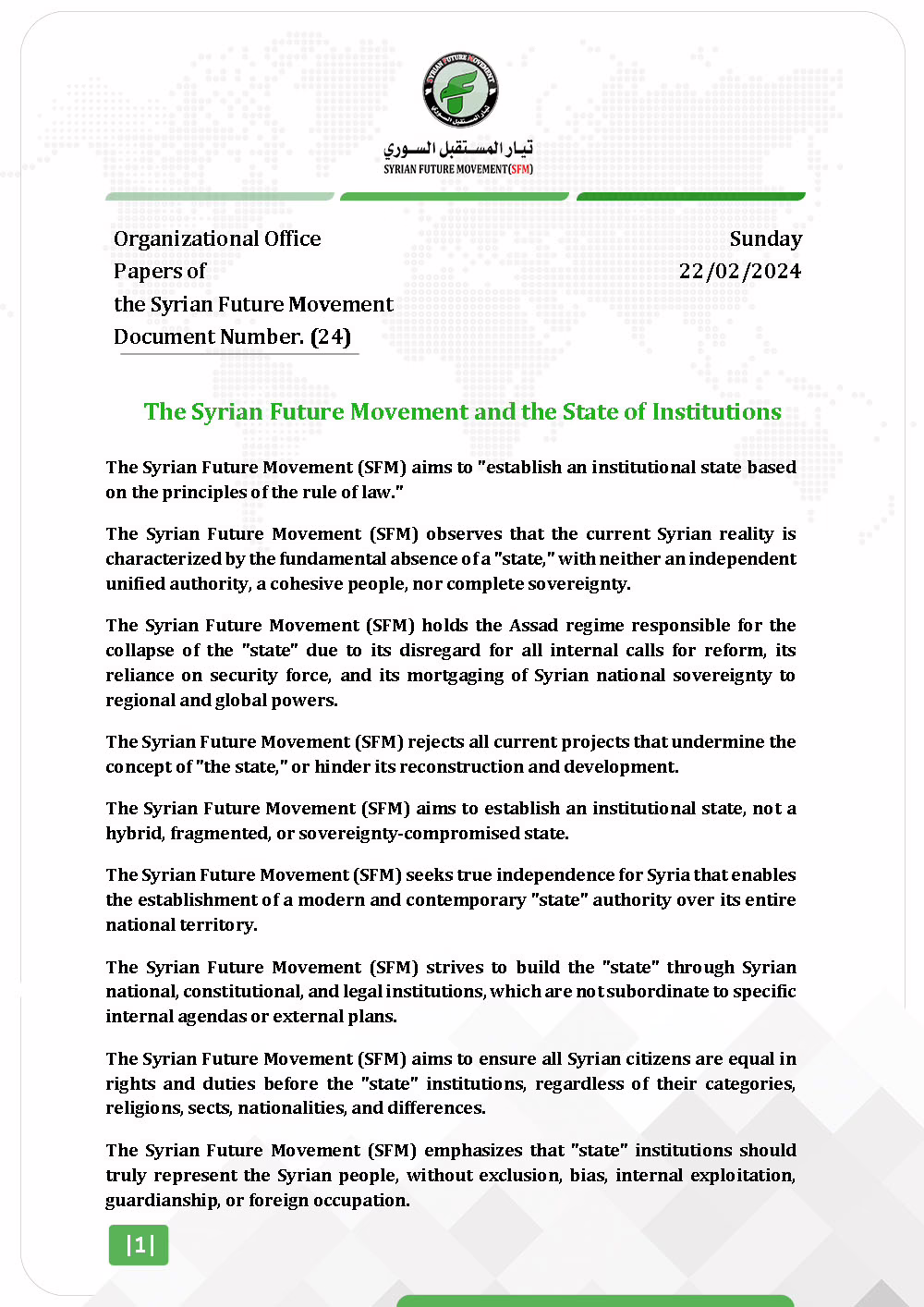 The Syrian Future Movement (SFM) strives to build the “state” through Syrian national, constitutional, and legal institutions, which are not subordinate to specific internal agendas or external plans.