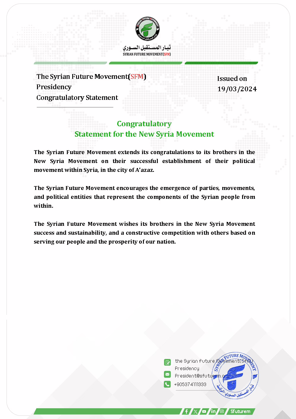 The Syrian Future Movement wishes its brothers in the New Syria Movement success and sustainability, and a constructive competition with others based on serving our people and the prosperity of our nation.