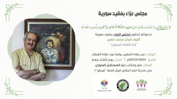 We invite you to attend the condolence gathering for the loss of Syria’s Major General Mohammad Faris, “The Syrian Astronaut.” Date: Tuesday only. Date: April 23, 2024 Time: From Maghrib prayer until after Isha prayer Venue: The headquarters and office of the Syrian Future Movement in Azaz (opposite the Safa Bakery (Habatou))
