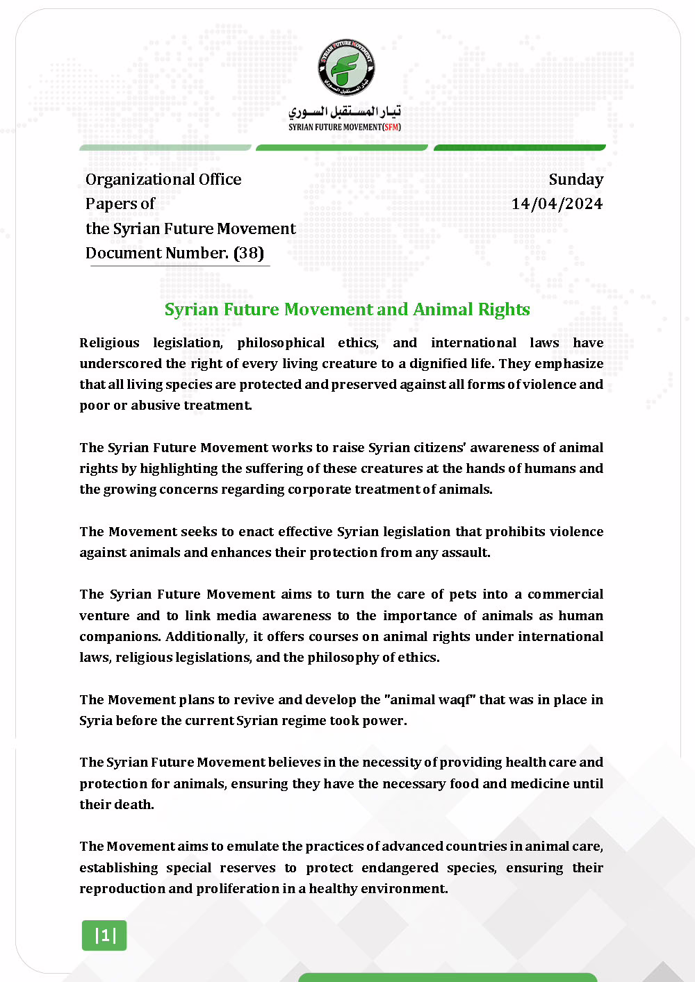 The Syrian Future Movement believes in the necessity of providing health care and protection for animals, ensuring they have the necessary food and medicine until their death.