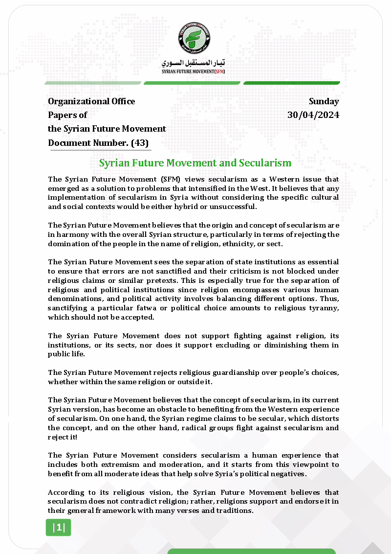 The Syrian Future Movement (SFM) views secularism as a Western issue that emerged as a solution to problems that intensified in the West. It believes that any implementation of secularism in Syria without considering the specific cultural and social contexts would be either hybrid or unsuccessful.