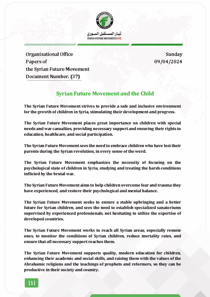 The Syrian Future Movement believes it is necessary to keep children away from all criminal activities, drugs, and acts contrary to morals and law.