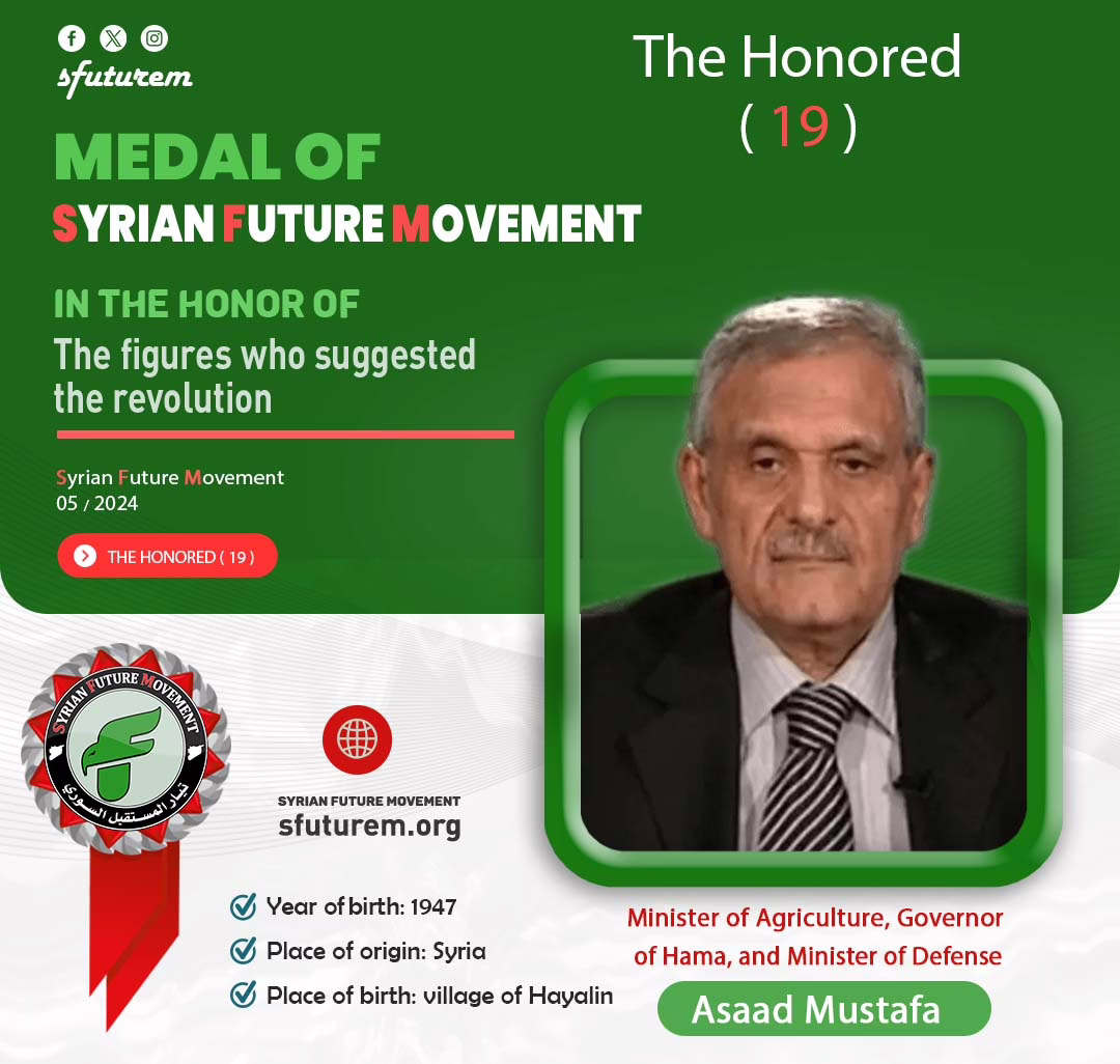 At the Syrian Future Movement, in recognition of his rich and diverse political, social, and professional history, and for standing with his people in their revolution against injustice and tyranny, and in gratitude to Syria’s great figures and men, we present this week the Syrian Future Movement’s Shield to Minister As’ad Mustafa, a symbolic Syrian shield that embodies our vision and inclusive national approach.