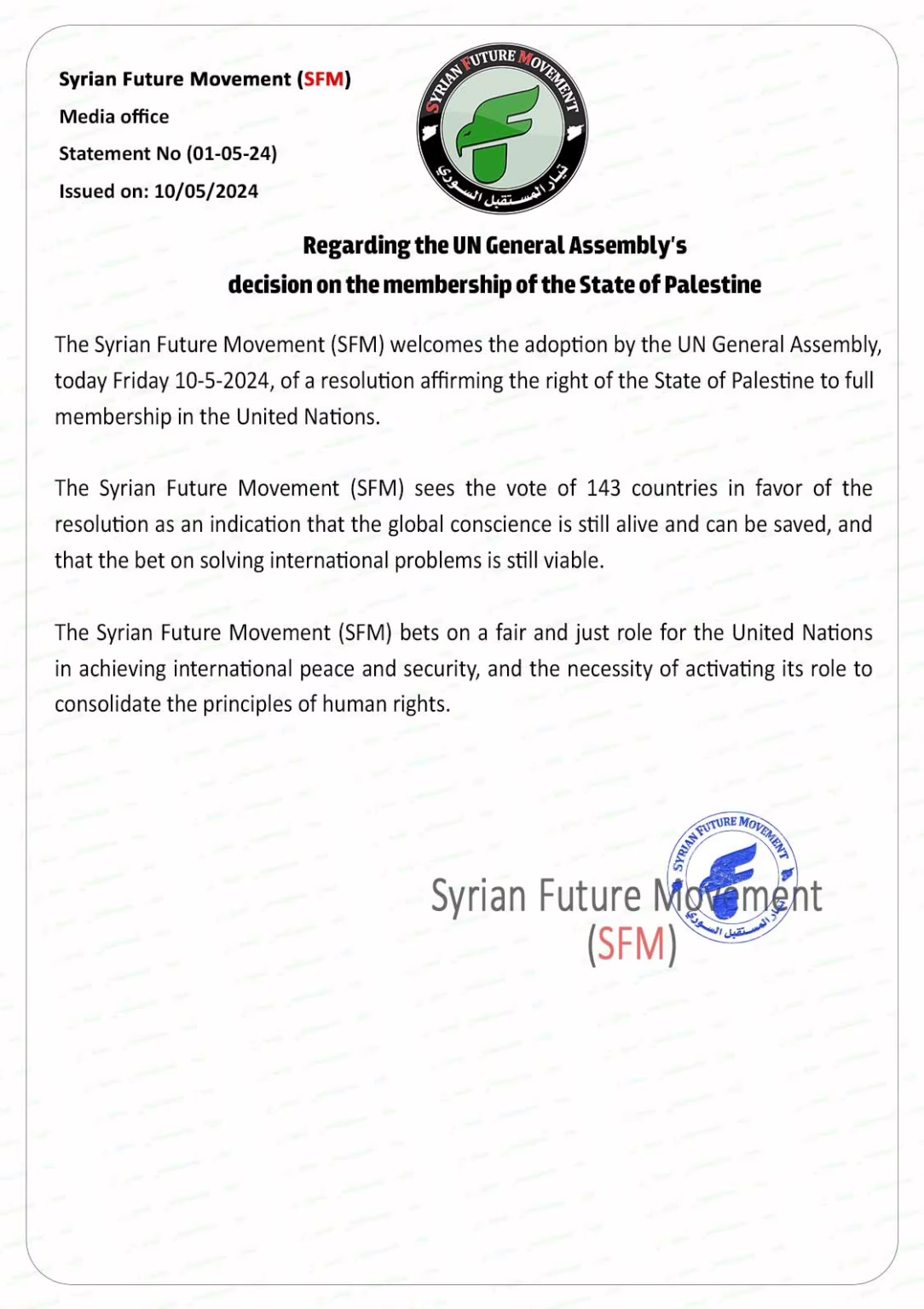 The Syrian Future Movement (SFM) welcomes the adoption by the UN General Assembly, today Friday 10-5-2024, of a resolution affirming the right of the State of Palestine to full membership in the United Nations.