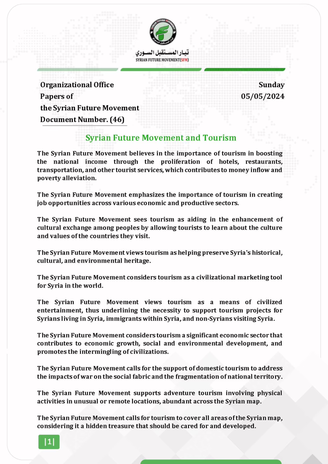 The Syrian Future Movement views tourism as a means of civilized entertainment, thus underlining the necessity to support tourism projects for Syrians living in Syria, immigrants within Syria, and non-Syrians visiting Syria.