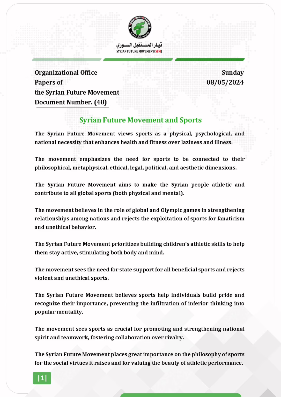 The Syrian Future Movement views sports as a physical, psychological, and national necessity that enhances health and fitness over laziness and illness.