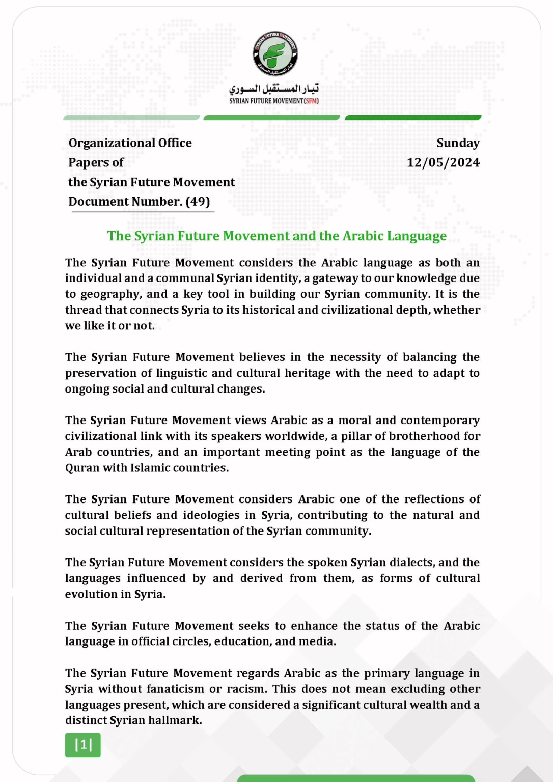 The Syrian Future Movement does not believe in the superiority of the Arabic language over other languages in Syria; it views it merely as a characteristic of Syrian society as a whole.