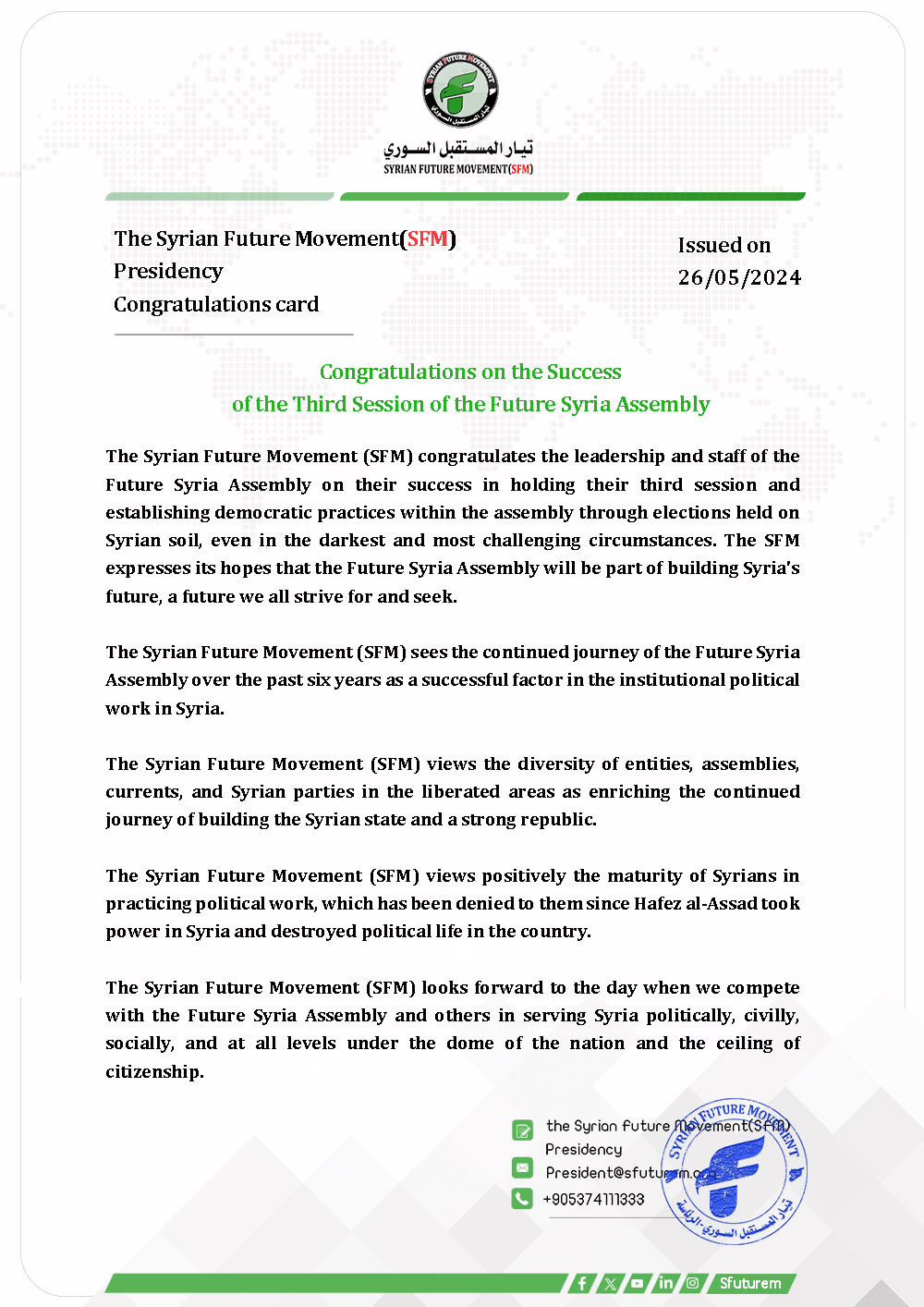 The Syrian Future Movement (SFM) congratulates the leadership and staff of the Future Syria Assembly on their success in holding their third session and establishing democratic practices within the assembly through elections held on Syrian soil, even in the darkest and most challenging circumstances. The SFM expresses its hopes that the Future Syria Assembly will be part of building Syria’s future, a future we all strive for and seek.