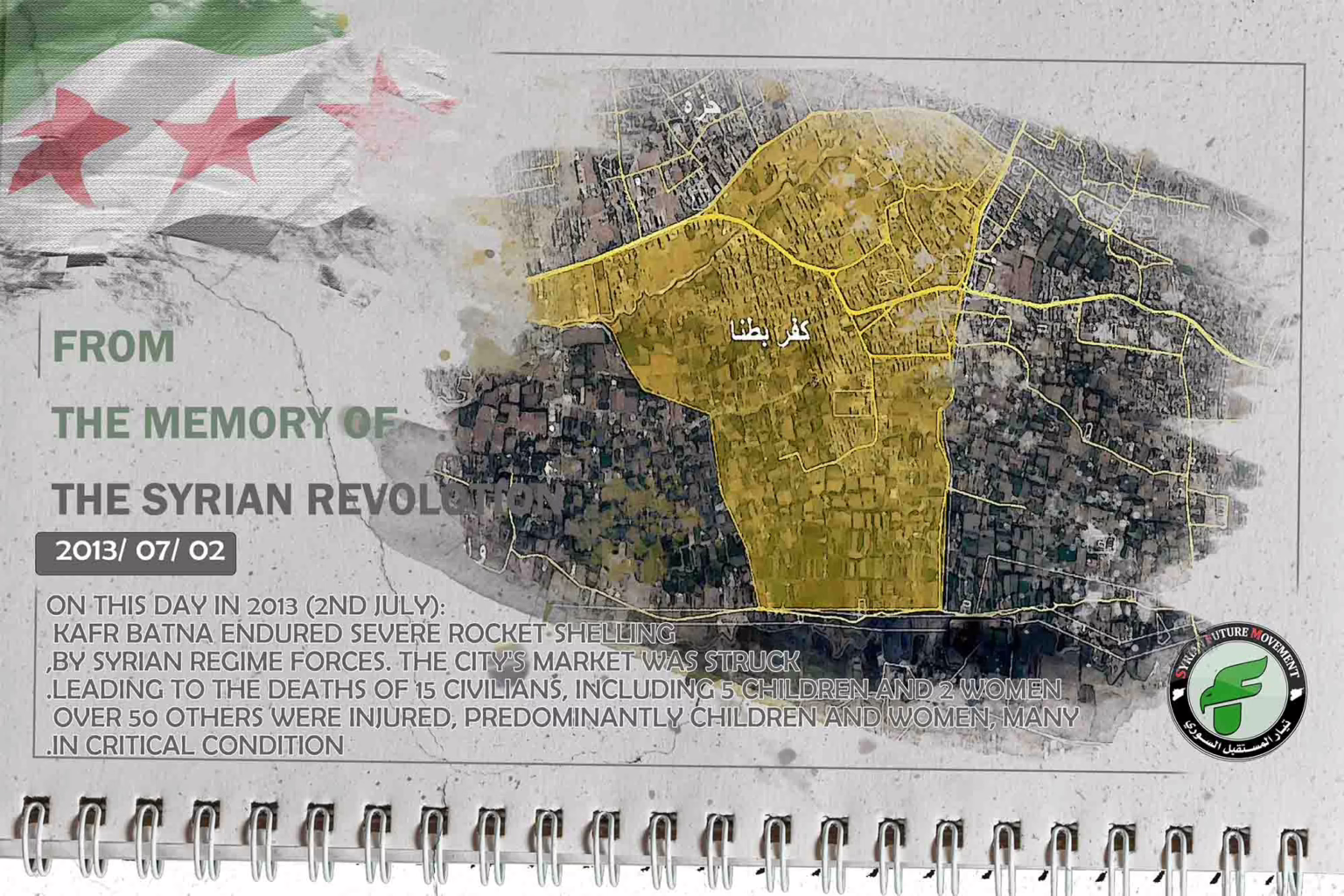 On this day in 2013 (July 2), the city of Kafr Batna was subjected to intense rocket shelling by Syrian regime forces. The shelling targeted the city’s market, resulting in the deaths of 15 civilians, including 5 children and 2 women. More than 50 others were injured, predominantly children and women, many of them in critical condition.
