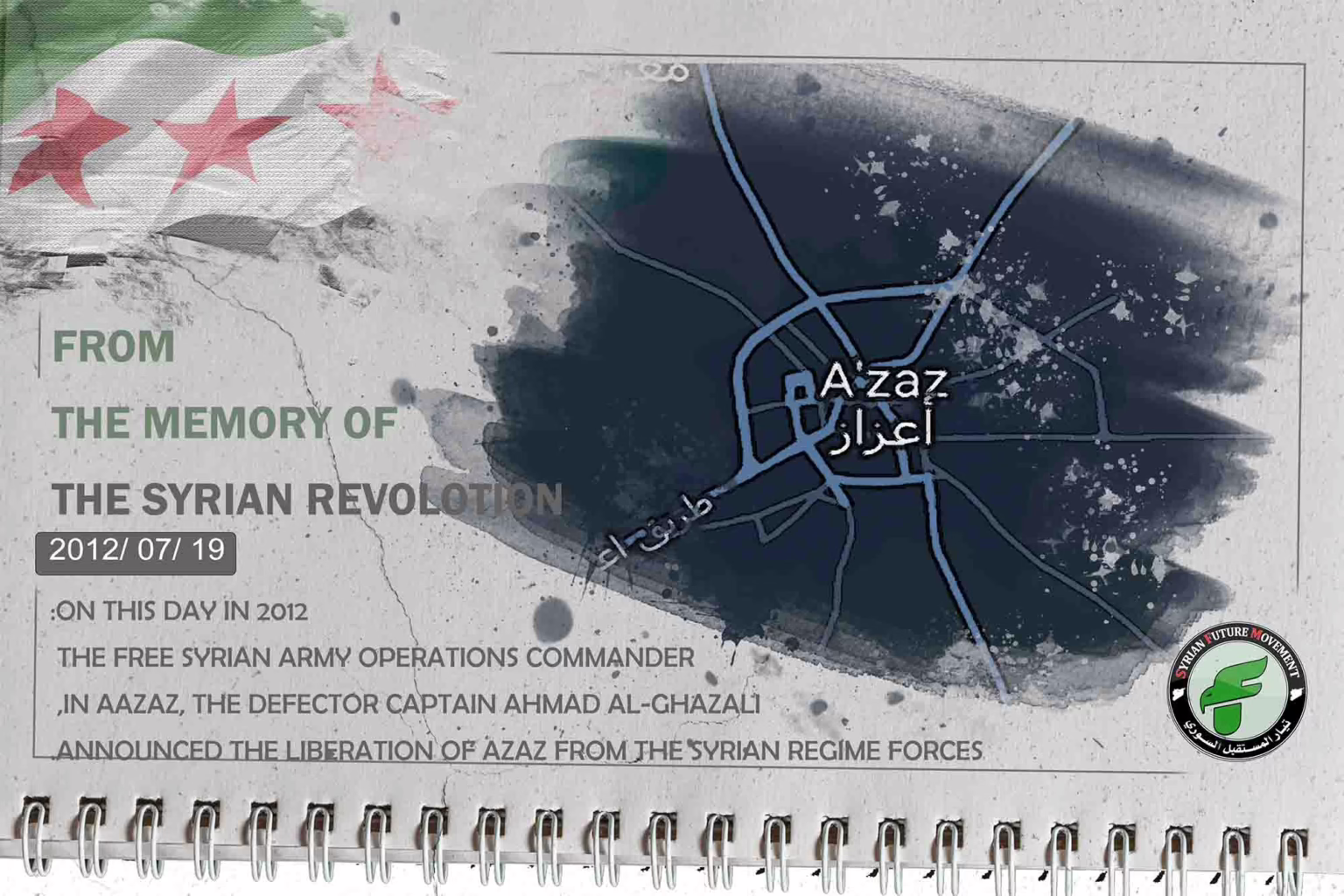 On this day in 2012, the commander of the Free Syrian Army operations in Azaz, the defector Captain Ahmed Al-Ghazali, announced the liberation of the city of Azaz from the Syrian regime forces.