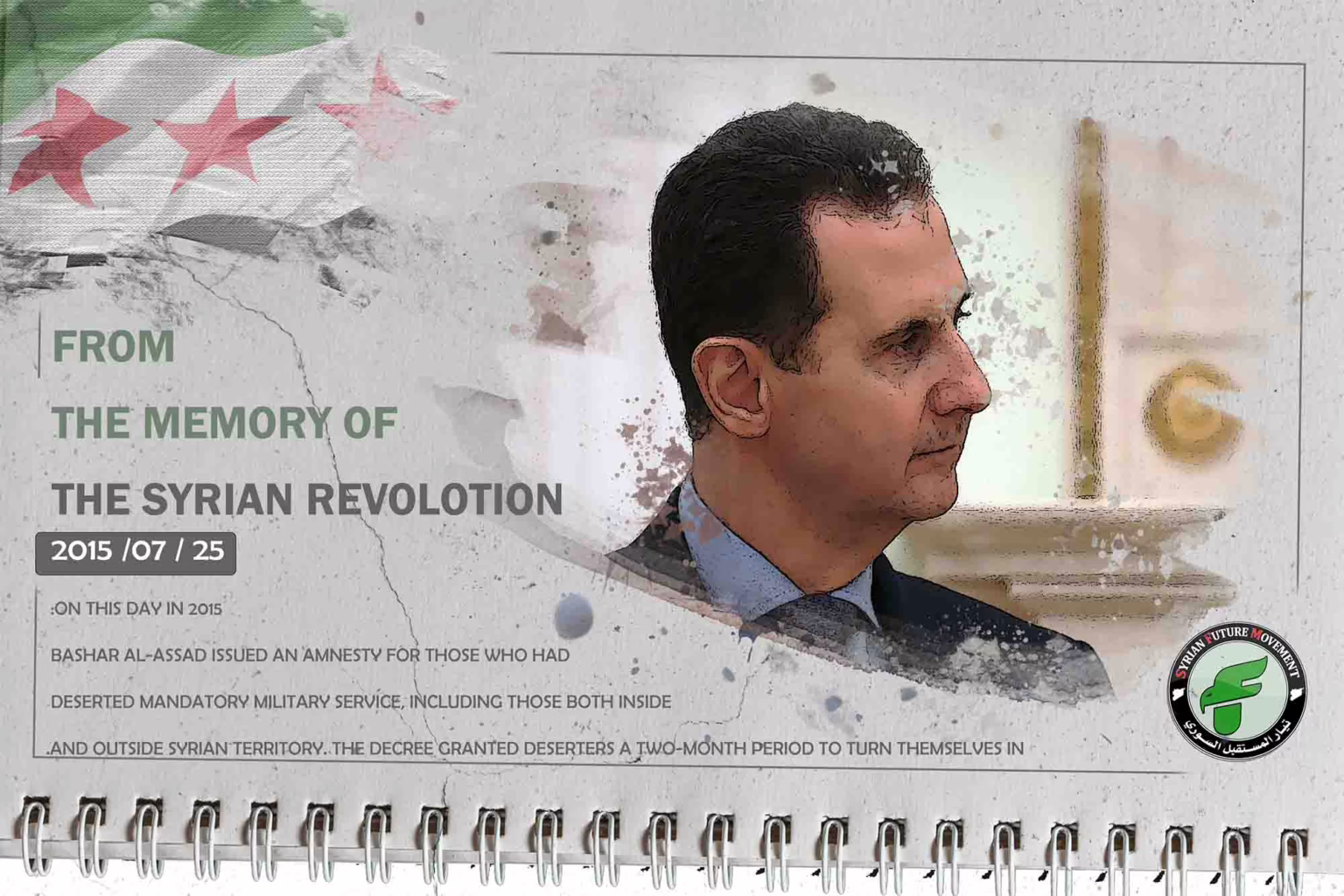 On this day in 2015: Bashar al-Assad issued an amnesty for those who had deserted mandatory military service, including those both inside and outside Syrian territory. The decree granted deserters a two-month period to turn themselves in.