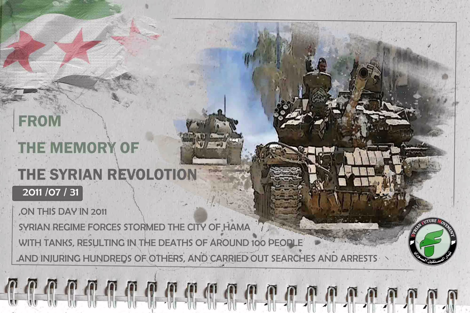 On this day in 2011, Syrian regime forces stormed the city of Hama with tanks amidst heavy gunfire, resulting in civilian casualties, including those who tried to confront the tanks with stones and Molotov cocktails. The regime forces conducted house searches, arrests, and set up checkpoints between neighborhoods and on main streets. The Syrian Observatory for Human Rights reported around 100 deaths and hundreds of injuries due to the regime’s attack.