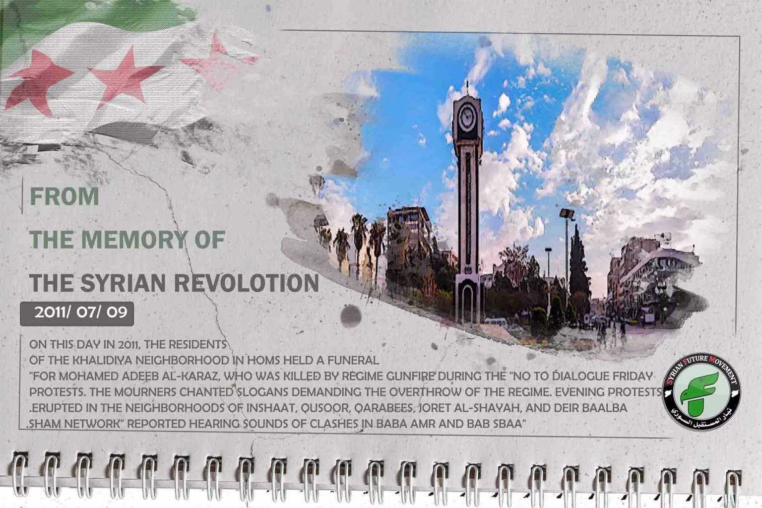 The residents of the Khalidiya neighborhood in Homs held a funeral for Mohamed Adeeb Al-Karaz, who was killed by regime gunfire during the “No to Dialogue Friday” protests. The mourners chanted slogans such as “With our soul, with our blood, we sacrifice for you, martyr,” and called for the overthrow of the regime and the accountability of Assad.