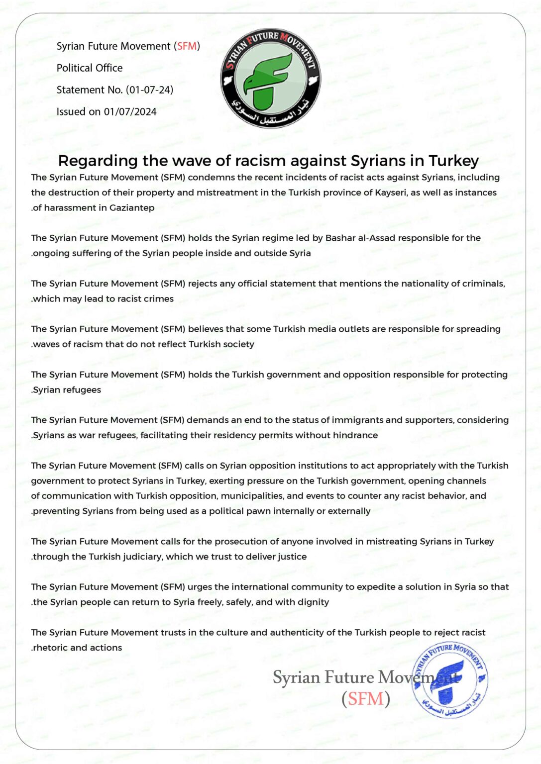 The Syrian Future Movement (SFM) calls for the prosecution of anyone involved in mistreating Syrians in Turkey through the Turkish judiciary, which we trust to deliver justice.