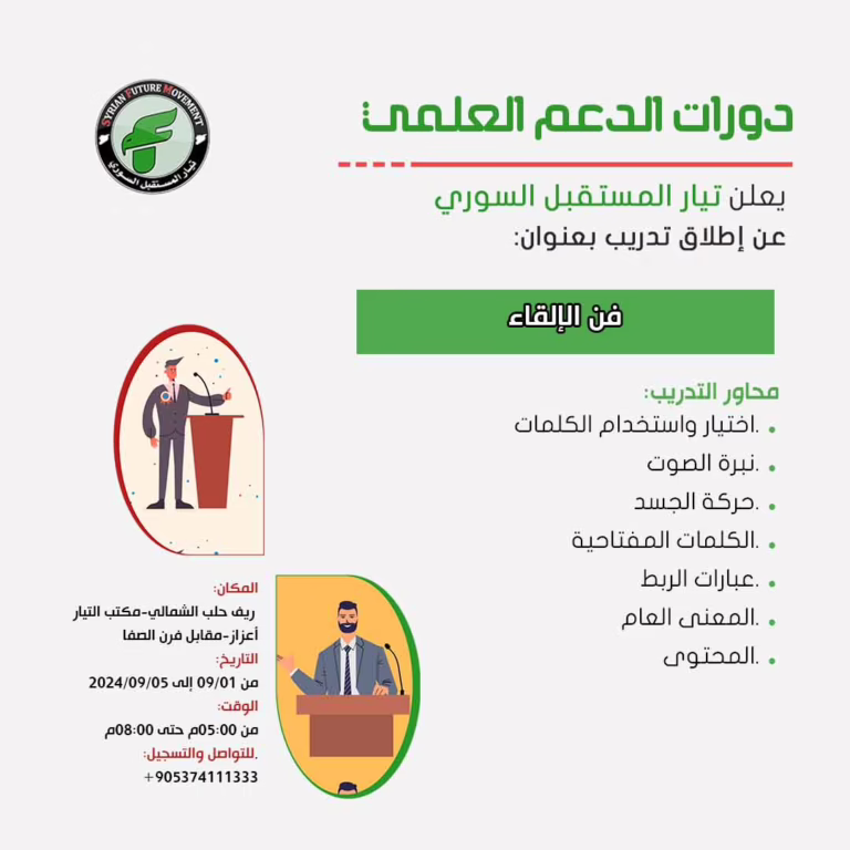 Public speaking training with the Syrian Future Movement to improve your communication and public speaking skills.