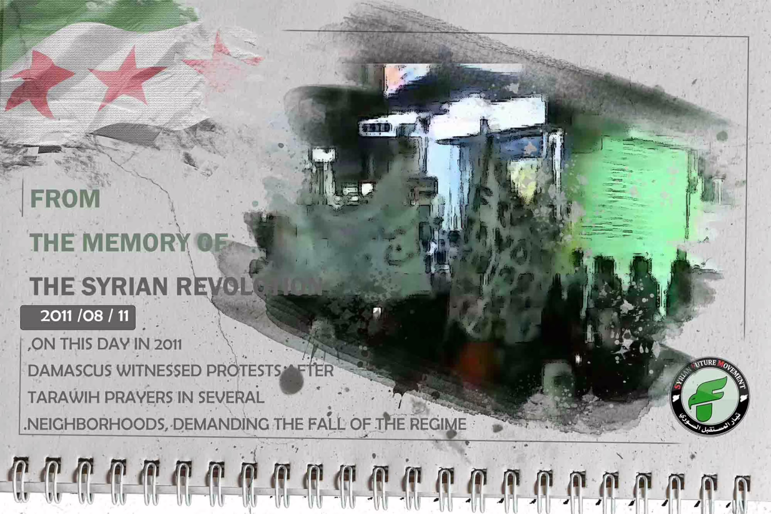 On this day in 2011, the city of Damascus witnessed demonstrations after Taraweeh prayers in several neighborhoods including Kafr Souseh (City Center Mall), Mashru’ Dummar, Al-Qadam, Al-Midan (Jazmatiyeh, Suhaib Al-Rumi Mosque), New Zahira, Barzeh, Barzeh Al-Balad, Nahr Aisha, Al-Qaboun, Al-Mazza (Al-Mustafa Mosque), Rukn Al-Din (Abu Al-Nur Mosque), and in front of Al-Kuwaiti Mosque (near the Ministry of Awqaf and the Political Security Branch). Protesters chanted in support of Homs, Hama, and Deir ez-Zor, and called for the downfall of the regime.