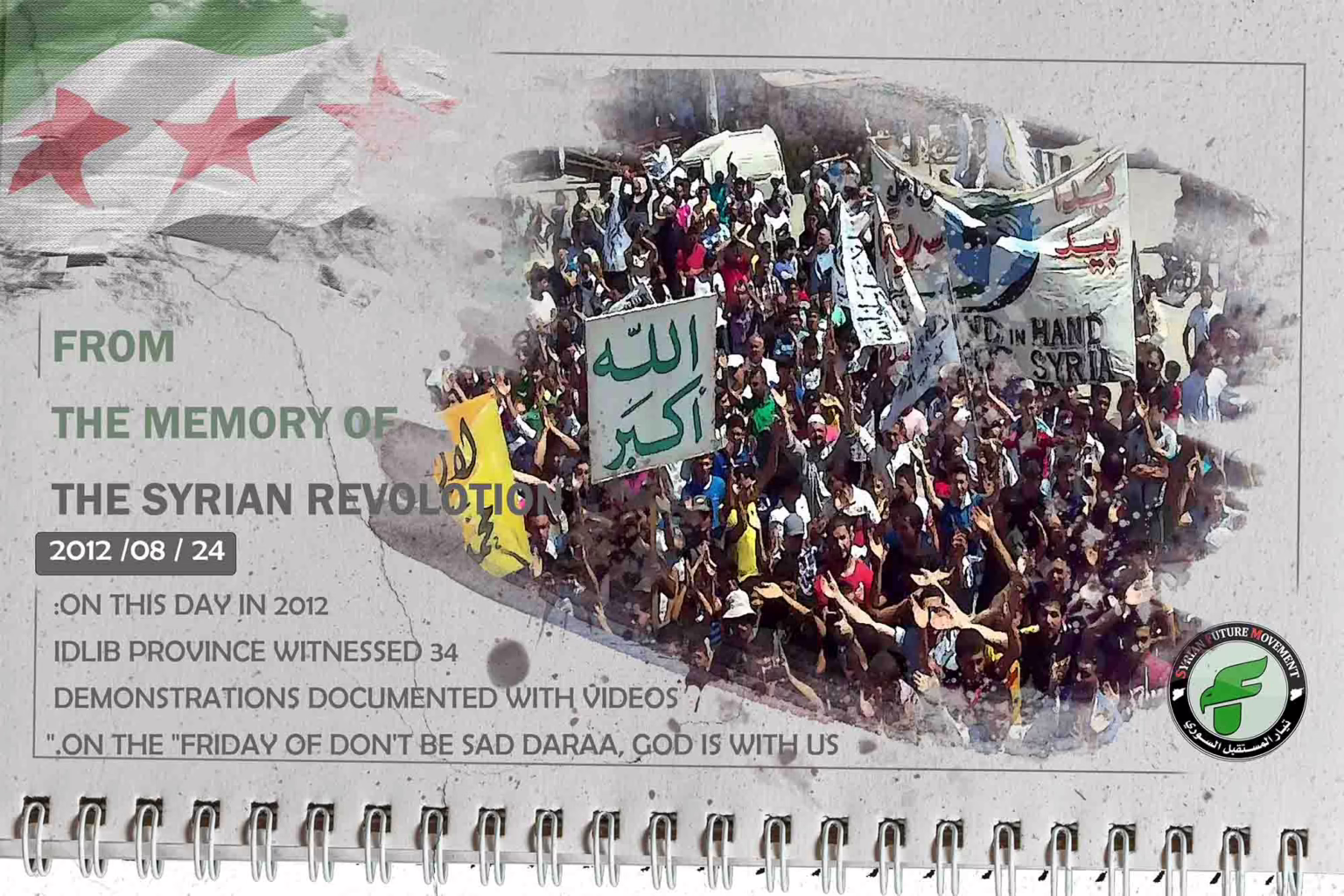 On this day in 2012: Idlib province witnessed 34 demonstrations documented with videos on the “Friday of Don’t Be Sad Daraa, God Is with Us.”