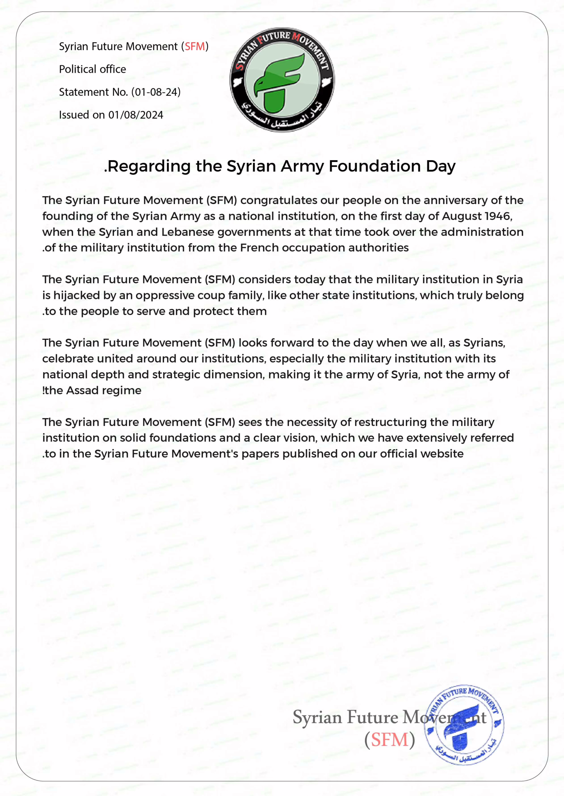 The Syrian Future Movement (SFM) congratulates our people on the anniversary of the founding of the Syrian Army as a national institution, on the first day of August 1946, when the Syrian and Lebanese governments at that time took over the administration of the military institution from the French occupation authorities.