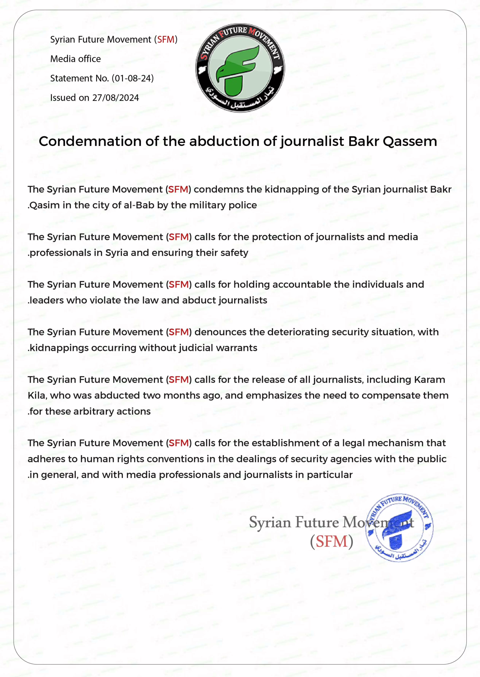 The Syrian Future Movement (SFM) condemns the kidnapping of the Syrian journalist Bakr Qasim in the city of al-Bab by the military police.