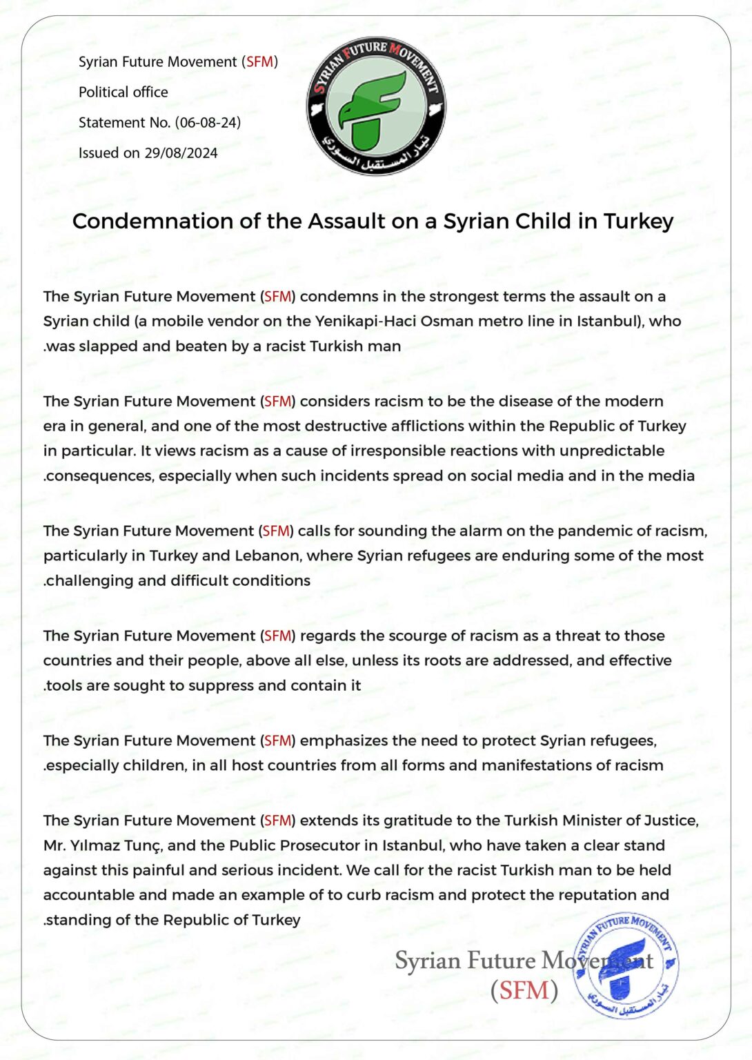 The Syrian Future Movement (SFM) extends its gratitude to the Turkish Minister of Justice, Mr. Yılmaz Tunç, and the Public Prosecutor in Istanbul, who have taken a clear stand against this painful and serious incident. We call for the racist Turkish man to be held accountable and made an example of to curb racism and protect the reputation and standing of the Republic of Turkey.